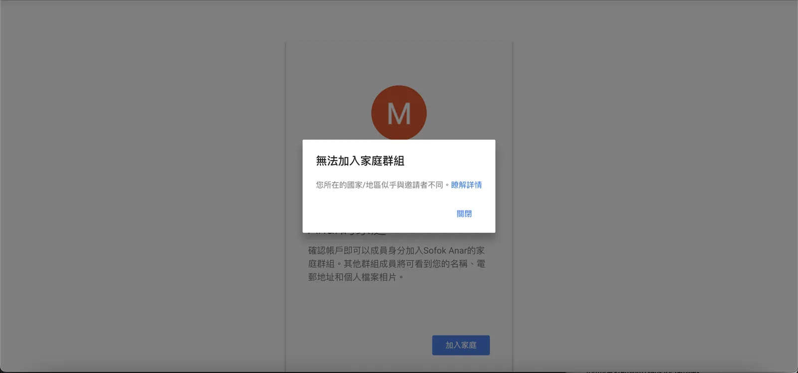 「無法加入家庭群組,您所在的國家/地區似乎與邀請者不同」